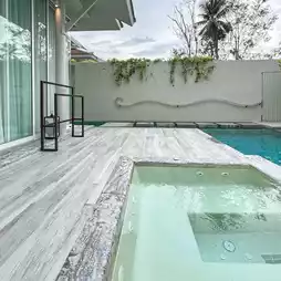 The room space can be divided into 4 main areas: the bedroom area with a sofa, mini bar, and a storage room for clothes and luggage. The bathroom area is separated into wet, dry and bathtub areas. Finally, the outdoor swimming pool area has a small pool, a jacuzzi and sun loungers.