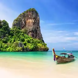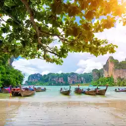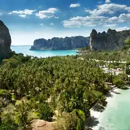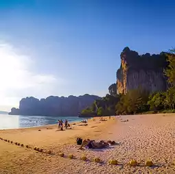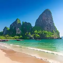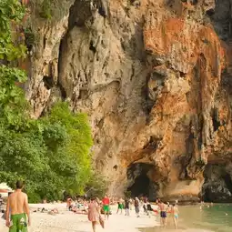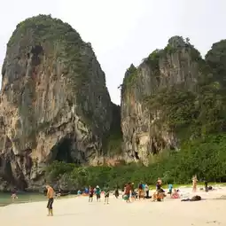 Railay Beach is located in Ao Nang Subdistrict, Mueang District, Krabi Province. It is in the area of Hat Noppharat Thara-Mu Ko Phi Phi National Park. It is a white sandy beach, outstanding with the beautiful limestone cliffs. Railay Beach has 2 sides: Railay West Beach (Nam Mao Beach), home to Phra Nang Cave, which has a shrine to Phra Nang that local sailors respect and worship. It is suitable for watching the sunset. Railay East Beach, with rocks separating the two beaches. In addition to the beautiful sandy beach and clear sea, Railay Beach also has a famous and popular activity among foreign tourists, which is rock climbing. At the end of the beach, there is a limestone cliff that is high, suitable for rock climbing. Rock climbing at Railay Beach can be done all year round. In April of each year, rock climbing activities are held regularly. Popular rock climbing areas are Railay East Beach, Ao Ton Sai, and Khao Nai Tham Phra Nang. #Railay Beach #Sea #Krabi