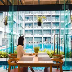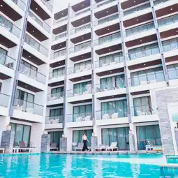 Today, May will take you to meet here, BlueSotel Krabi Aonang Beach, which is an accommodation priced at a little over a thousand baht, divided by just a red card, but very beautiful and complete, whether it's a stunning swimming pool, a cocktail bar, delicious smoothies, a fitness center, a spa, a buffet restaurant with a lot of food and excellent service.