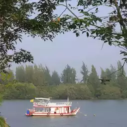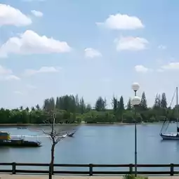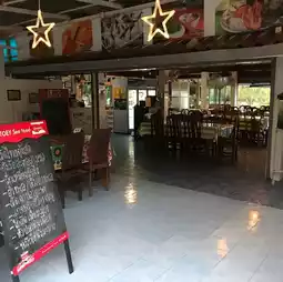 A homely restaurant on the banks of the Krabi River, near a public park. People were jogging here and there. The weather was nice and not hot today. The restaurant was just right for a relaxing place to sit and relax.