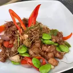 Stir-fried pork with shrimp paste. A menu that you shouldn't miss. So delicious that we had to order more. And our group ordered a box to take home to catch the plane back to Bangkok.
