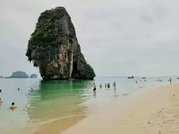 Phra Nang Beach is no more than 800 meters long. The beach is beautifully situated. At high tide it becomes quite narrow, especially in the middle part. The sand on the beach is very fine. Conditions for swimming are very good (snorkeling is good). "Long boats" are parked mainly in the middle part of the beach. In high season the beach is very crowded. Paid showers and toilets are available at the entrance to the beach, close to the Princess Cave.