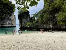 🧊 The inside of the lagoon is a dark greenish-blue color like emerald green, surrounded by steep cliffs. When the tide goes out, you will see clear water and white sand. We can go down and stand in the sea. But when the tide goes out, you will see the sea water that is emerald green.