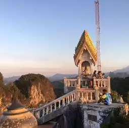 The atmosphere inside the temple is surrounded by trees, providing a shady environment. You need to climb 1,237 steps to reach the top, where you can enjoy a panoramic view of Krabi province, including the Khao Khanap Nam mountains. The view offers a 360-degree perspective.