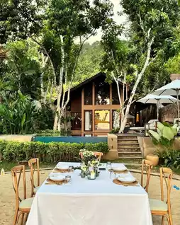 The Tubkaak Krabi Boutique Resort is approximately a 20-minute drive from Ao Nang Beach and approximately a 45-minute drive from Krabi Airport. The resort's dining options include Arundina Restaurant, which serves Thai and European dishes and is surrounded by lily ponds with sea views, providing a relaxing dining environment for guests.