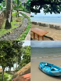 During my three days in Krabi, I stayed at the Shambhala@Koh Buri Resort. The forest setting was top-notch, incredibly peaceful, filled with lush greenery and small streams. The resort is so well-maintained that there weren't even any mosquitoes! The room was comfortable, with a wake-up call service provided by birds every morning, and a private pool for soaking. Island hopping was also very convenient, with long-tail boats available right on the beach. Koh Hong is just across the water, very close. The tide goes out around 4pm, so I took my kids clam digging for two days and we found lots of little crabs. The sunset views were simply stunning, beyond words!