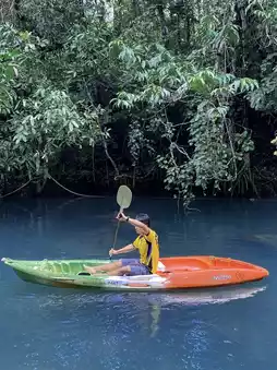 When you come to Krabi, if you don’t go to the islands and the sea, where else can you go? This trip, I would like to recommend a place to stay by the canal to my friends, in case you don’t want to go to the sea when you go to Krabi. It is perfect for relaxing and recharging your energy to get back to work. This accommodation is located in the middle of nature, both forests and natural canals with very clear water. There are many activities to do, you will never get bored, such as kayaking, floating on rubber rings, and there is also a swimming pool near the canal. The accommodation is private, there are not many houses, and there is a new zone that is a building with beautiful minimalist decorations. For this trip, we booked a pool villa with 2 bedrooms, 2 bathrooms, 1 living room, with a swimming pool and a room in the building on the lawn. If anyone is looking for a place to relax and unwind, focusing on relaxing in the middle of nature, this place is definitely the answer because you don’t have to go out and do any activities. Just the accommodation alone will make the day go by very quickly. And what can’t be left unmentioned is the breakfast set that comes in a very cute bento box. It is served as local food, such as sticky rice with fried chicken, spicy rice salad, and rice vermicelli with curry. The accommodation has a menu for you to choose from, depending on what you want to eat.