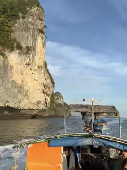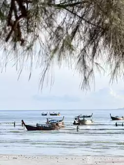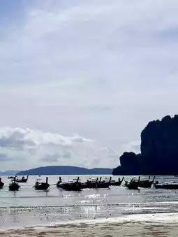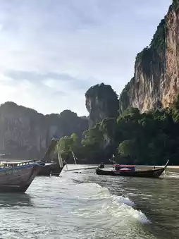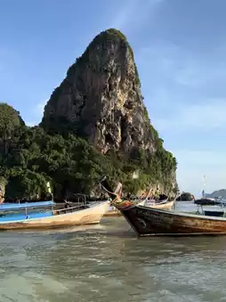 Railay Beach is located near Ao Nang and is a popular destination for tourists, especially those who enjoy rock climbing. It can be accessed by boat from Ao Nang, which takes about 10 minutes. The beauty of Railay Beach is enhanced by the surrounding mountains, crystal-clear waters, and stunning scenery. The beach is particularly famous for its breathtaking sunsets, where the sunlight reflects off the cliffs into the bay, creating a picturesque view. Rows of coconut trees and fishing boats lined up along the shore give the area a serene, paradise-like atmosphere. Railay Beach also offers numerous cafes, such as Tew Lay Cafe, which boasts beautiful views. It's recommended to visit in the morning when the tide is high, but less so in the evening when the tide is low.
