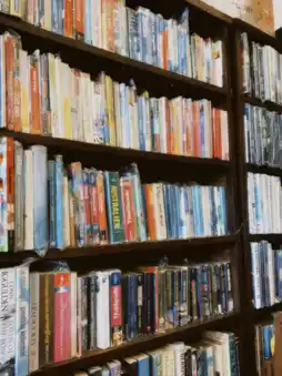 The café is decorated with wooden furniture and bookshelves filled with English books, creating the feel of a small library. Soft jazz music plays in the background, adding to the relaxing ambiance.