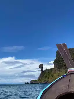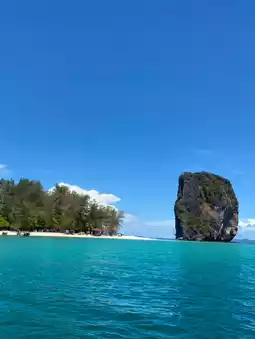 🏝️ The second island, Koh Poda, is an island close to the shore. It doesn't take long to get on the boat. The water color is beautiful. The highlight of Koh Poda is the rock that looks like a sailboat's fin. It stands out in front of the beach.