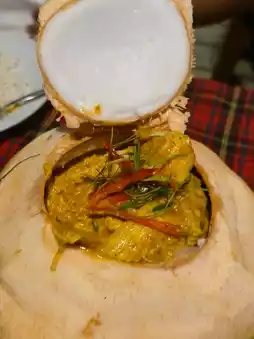 * Sour curry with young coconut and sea bass: A strong flavor, rich with authentic southern sour curry spices. The sea bass is fresh and sweet.