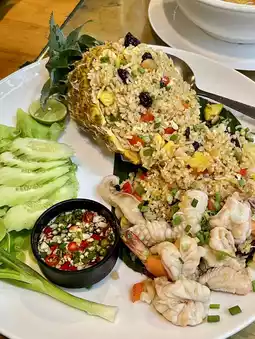 This cafe stands out for its lush, natural setting. Offering a variety of seating options, including a treehouse-style setting, it's a popular spot for tourists seeking relaxation and photography in Krabi. They mostly serve simple single-dish meals, such as pineapple fried rice and delicious spaghetti.