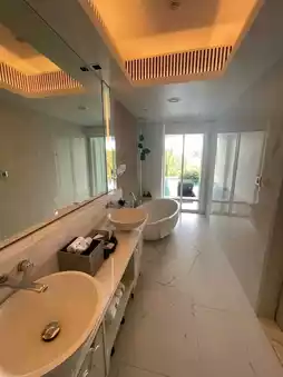 I stayed in a 129-square-meter Deluxe Garden Pool Suite, room number G107. The living space was perfect. The bathroom was well-proportioned, with a shower, bathtub, and his-and-hers sinks. There was also a walk-in closet, and the bedroom was a perfect place to jump right into the saltwater pool.