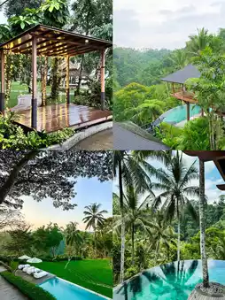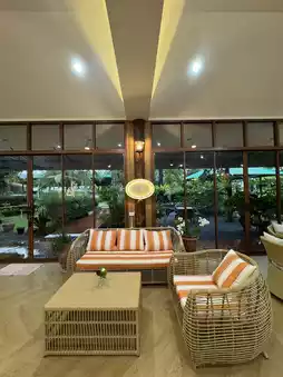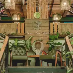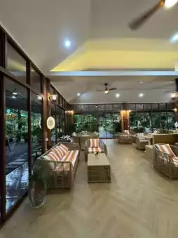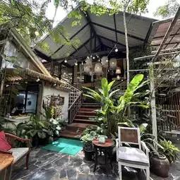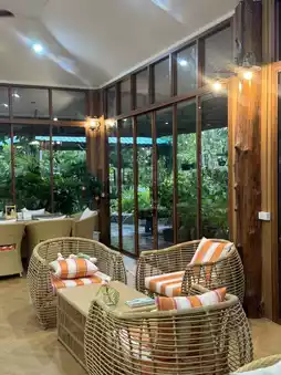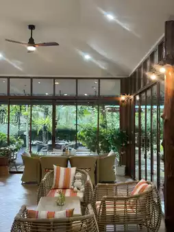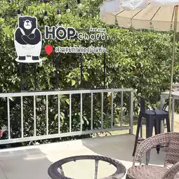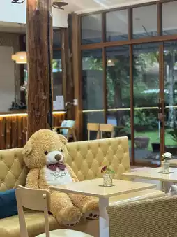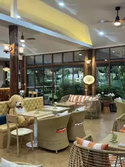 The cafe is decorated in warm tones with rattan furniture and pastel-colored pillows, creating a mini resort feel amidst a garden. There are seating areas both inside the air-conditioned room and by the lush green windows, complete with a large teddy bear for adorable photo opportunities.