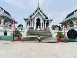 • In front of the white and gold ordination hall contrasting with the bright blue sky