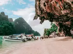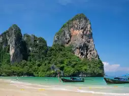 Reachable only by boat, Railay is famous for its towering cliffs and turquoise waters. Explore Phra Nang Cave, hike to the Viewpoint, and cool off in the Emerald Lagoon.