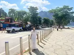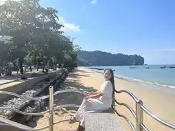 Today, we'll take you to Krabi. This beach is called Ao Nang. It's a popular beach for tourists strolling along the shore. It's also where tourists board boats to other islands. There are many shops and it's also a great place to buy boat trips to the islands. Or, you can just take a leisurely stroll. The evening atmosphere is absolutely stunning.