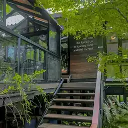 The cafe offers a slow-life atmosphere, close to nature. In front of the shop, there is a wooden door 🚪. When you open the door, you will see a long wooden bridge. The side of the wooden bridge is full of green grass. 🌿 When you see it, it is very wow!! It feels like we have been transported to another world.