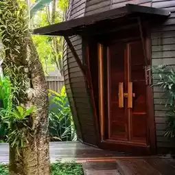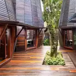 πͺπβππ¬πππ©π ππ©ππͺLooking from the outside of the spa, it reminds me of the shape of a #monkey pitcher plant. It uses hardwood with overlapping scales to form a tall conical architecture with a lid on top of 3 buildings.