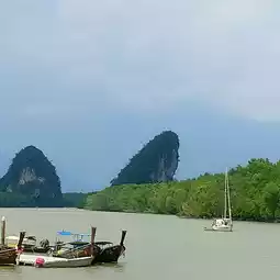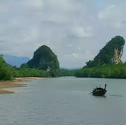 Khao Khanap Nam is a tourist attraction that is a symbol of Krabi. It is made up of two limestone mountains (Krabi's Twin Mountains) standing tall on the Krabi River in front of the city.