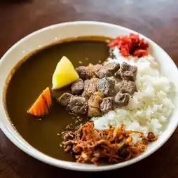 As for the food here, there are curry rice to choose from, including fried shrimp curry rice, fried chicken, and beef (no pork because this place is mostly a Muslim community).