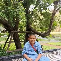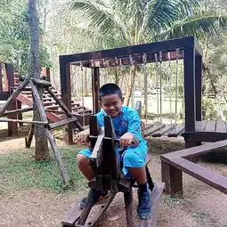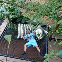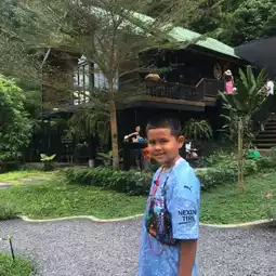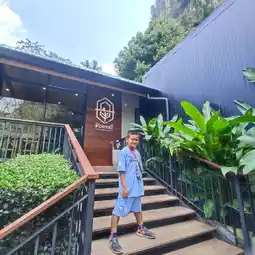 Into The Forest is a cafe surrounded by large trees. A rubber plantation in front and mountains in the back, the atmosphere is shady, peaceful, and refreshing at the same time. The cafe is decorated invitingly and offers food, drinks, and desserts. There are several chill-out areas, both inside the cool air-conditioned area and outside with the lush greenery. I arrived at noon and it wasn't hot at all, but rather cool. I even took a nap. There's a slide and benches for kids (but my kids complained their butts hurt because they were made of wood 😅). The staff are lovely, and most importantly, there are plenty of photo spots.