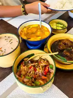 Must-try dishes include the spicy and perfectly seasoned sea bass curry with coconut shoots, the tender and flavorful braised pork belly, and the stir-fried morning glory with eggs. A must-order for everyone, a meal that combines rich flavor and familiarity.
