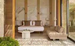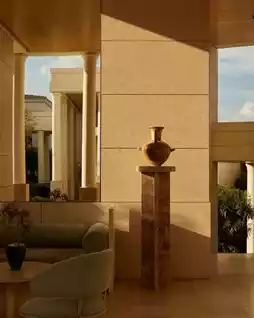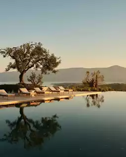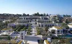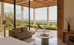 Amanzoe's accommodations are divided into villas and pavilions, reinterpreting ancient Greek architecture in a contemporary style, promoting residences that blend indoor and outdoor spaces, with spacious terraces, outdoor pools, formal gardens, and luxurious colonnades.