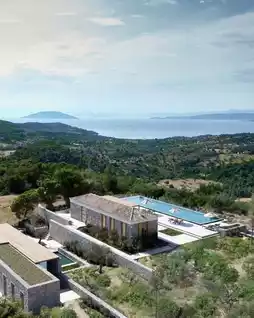 The villas' aerial pavilions are built above olive groves and winding coastlines, offering breathtaking views of the poetic Greek scenery.