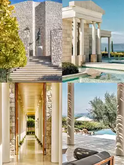 Inspired by classical Greek architecture, Amanzoe has a pure and simple natural temperament, attempting to create a modern Acropolis with majestic colonnades and marble-paved corridors. Harmoniously integrated with nature, it is tranquil, capable, and simple, presenting Platonic truth, goodness, and beauty.