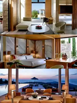 Amanzoe's peaceful and modern style is like a Mediterranean-style temple. The hotel is surrounded by vineyards, olive groves, pine forests, and ancient sites such as the Temple of Hera and Thessaloniki's Demetrius. There are many historical sites, including temples, castles, tombs, and ancient cities. The resort can arrange short trips for guests to explore these historical sites.