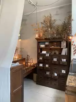 A serene and aesthetic cafe nestled in a quiet alley, featuring an interior perfect for photos and a space imbued with a florist's touch.