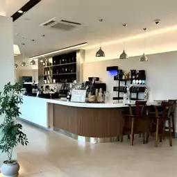 The white-themed interior features large windows and spacious seating. The cafe is open from 8:30 AM.
