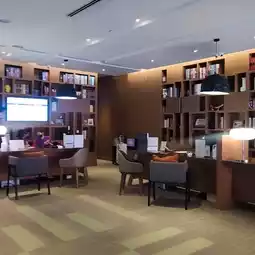 The lobby is decorated with books like a library.