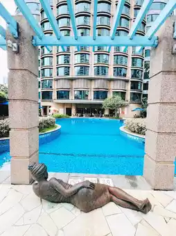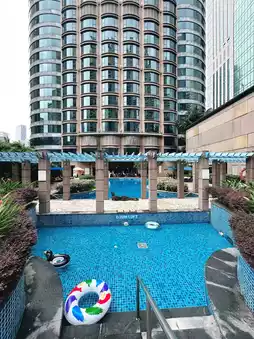The swimming pool at Westin Hotel Kuala Lumpur is located at level 4 and it is the same floor as the function rooms. There was some birthday party on that day and the kids were playing by the swimming pool. There are 2 pools here and the bigger pool is 1.45 meters deep. So please bring the children to the children pool on the other side. There is no lifeguard but the hotel provide swimming floats which are free to use. The pool is circular in shape and it overlooks to JW Marriot hotel. So there is not much sun for sun tanning here.