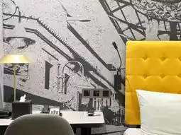 The yellow headboard and noble blue curtains add to the design sense of the room.
