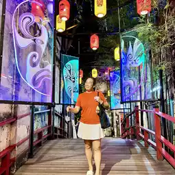 Crossing over the Red Bridge, visitors are welcomed by illuminated “Flower Faces” (花臉) leading to a modern minimalist tunnel structure inspired by a Chinese Opera Doyenne’s headdress.