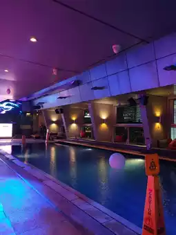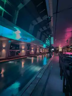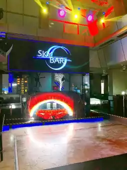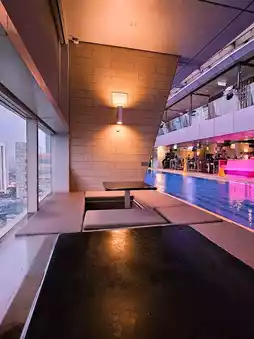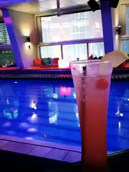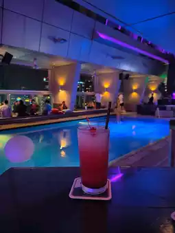 The atmosphere at Sky Bar is really chill. There's a pool right in the middle of the bar, which adds a cool vibe to the whole setting. The seating area is cozy with large cushions, perfect for relaxing while enjoying the view. I ordered a refreshing cocktail, and sipping it while looking at the city lights felt so relaxing.