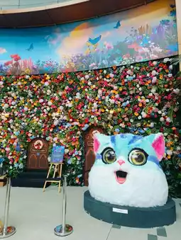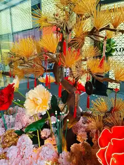 The grand centerpiece caught my attention first—a stunning setup of oversized golden coins surrounded by blooming flowers. It felt like a celebration of prosperity and joy, perfectly embodying the spirit of the season. The iconic lucky cat statue stood proudly, adding a playful charm to the scene.