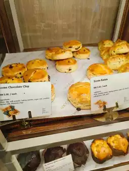 The shelves were lined with a wide variety of baked treats, from rustic loaves of bread to colorful cakes and pastries. The scones caught my eye, especially the chocolate chip and raisin ones—they looked irresistible. Each item was beautifully presented, and you could tell the care and effort that went into making them.