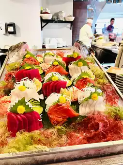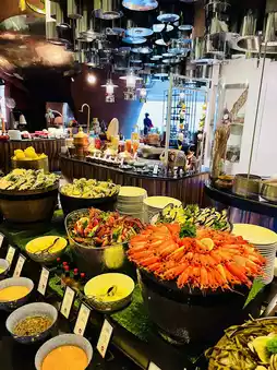 In addition to the seafood selection, guests can enjoy a variety of international cuisines. The buffet features interactive show kitchens serving dishes from Chinese, Indian, and Western culinary traditions. Highlights include dim sum, roasted meats from the carvery, freshly baked pizzas, and a diverse dessert sections (various cakes and chocolates) with live cooking stations. This is indeed one of the best luxurious buffet options in KL City.