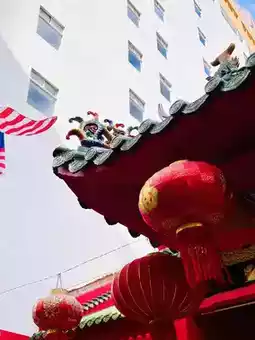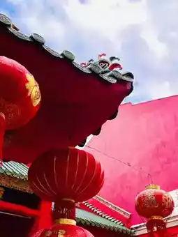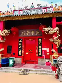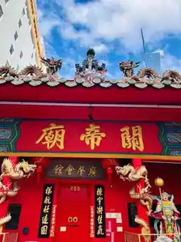 Architecturally, the temple features a vibrant orange façade guarded by two stone lions, symbolizing protection. Inside, visitors can find wooden statues of Guan Di, his son Guan Ping, and loyal general Zhou Cang.