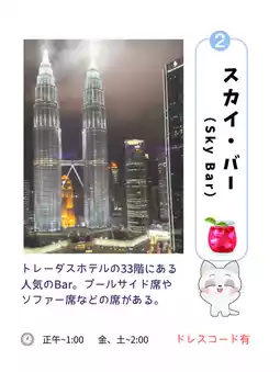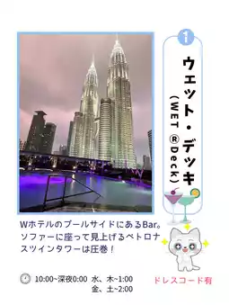 When it comes to breathtaking views in Kuala Lumpur, Malaysia, the beautiful Petronas Twin Towers are famous! The daytime scenery is wonderful, but the illuminated Twin Towers create a luxurious atmosphere that you can gaze at forever✨ A BAR where you can relax and enjoy a drink in elegance is definitely a must-experience.