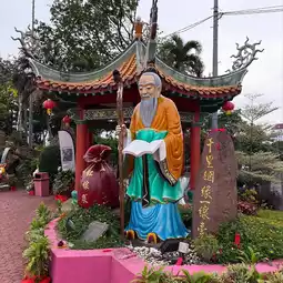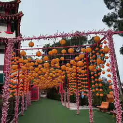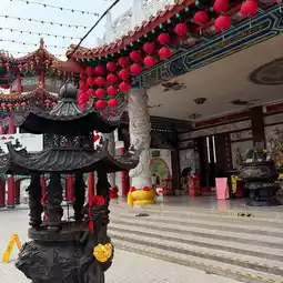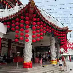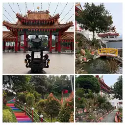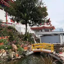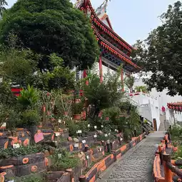 The temple entrance is free, and the place is very well organized. The design is unique with red colors and Chinese decorations, and the view from above offers a beautiful cityscape. There is a flower corner, a small garden, a peaceful atmosphere, and spots for photos.
