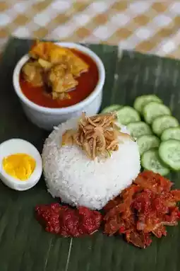 ➜ The Flavor: Creamy coconut rice meets a spicy sambal punch, paired with crunchy anchovies, peanuts, cucumber, and a boiled egg or tender chicken for a rich, balanced bite.
