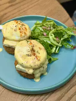 • A classic Eggs Benedict with silky hollandaise and runny yolk perfection