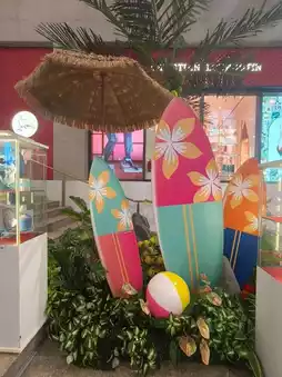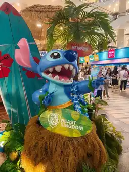 During my Kuala Lumpur trip, I came across this adorable Stitch-themed area at Pavilion KL, and it instantly felt like a tropical escape. The whole space was decorated with surfboards, palm leaves, and colorful signs that said “Ohana” and “Island Life.” The highlight? A giant surfing Stitch statue and a wave backdrop perfect for photos!