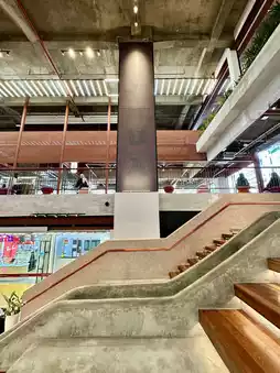 Once a modest mall near the bustle of Jalan TAR, Semua House now turns heads with its confident post-renovation identity. Open-air walkways, giant fans, industrial steelwork, and polished concrete set the tone—but it’s the signature spiral slide staircase that steals the show.