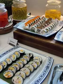 There’s also a buffet spread featuring sushi, sashimi, seafood on ice, and local favourites — perfect if you love variety. The whole setup feels relaxed yet refined, great for casual gatherings with a bit of flair.