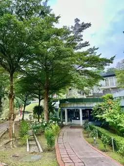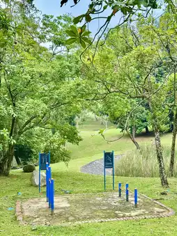 Just a short stroll from the main entrance and jogging track, this gentle cascade offers a tranquil visual rhythm, framed by tropical greenery and shaded paths. While not towering or thunderous, its charm lies in the intimacy of the setting. The soft rush of water over the rocks creates a calming soundtrack that feels like nature’s own meditation guide.